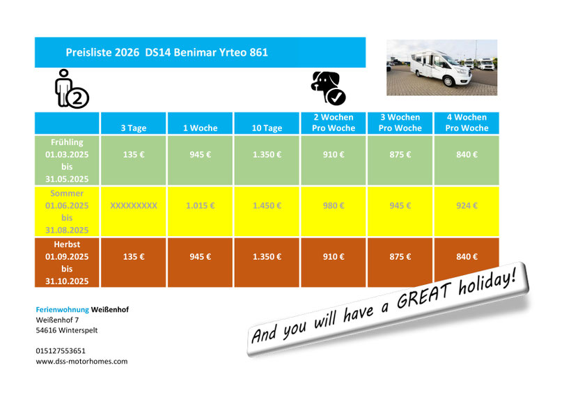 Von 01 Juni bis 31 August sind nur Buchungen ab 7 Tage möglich.